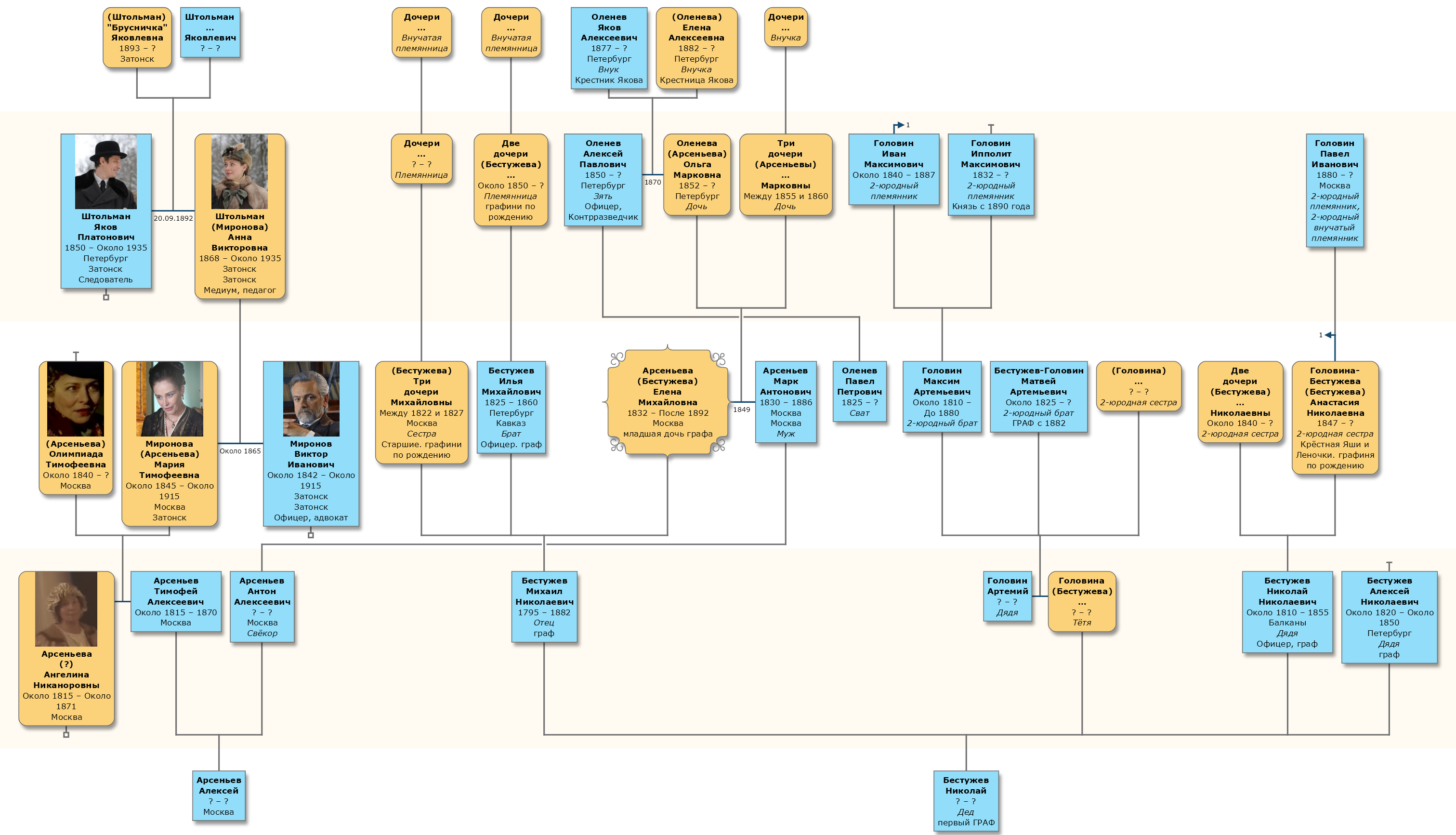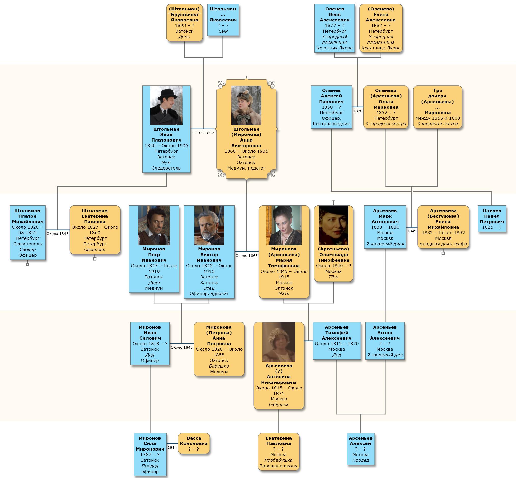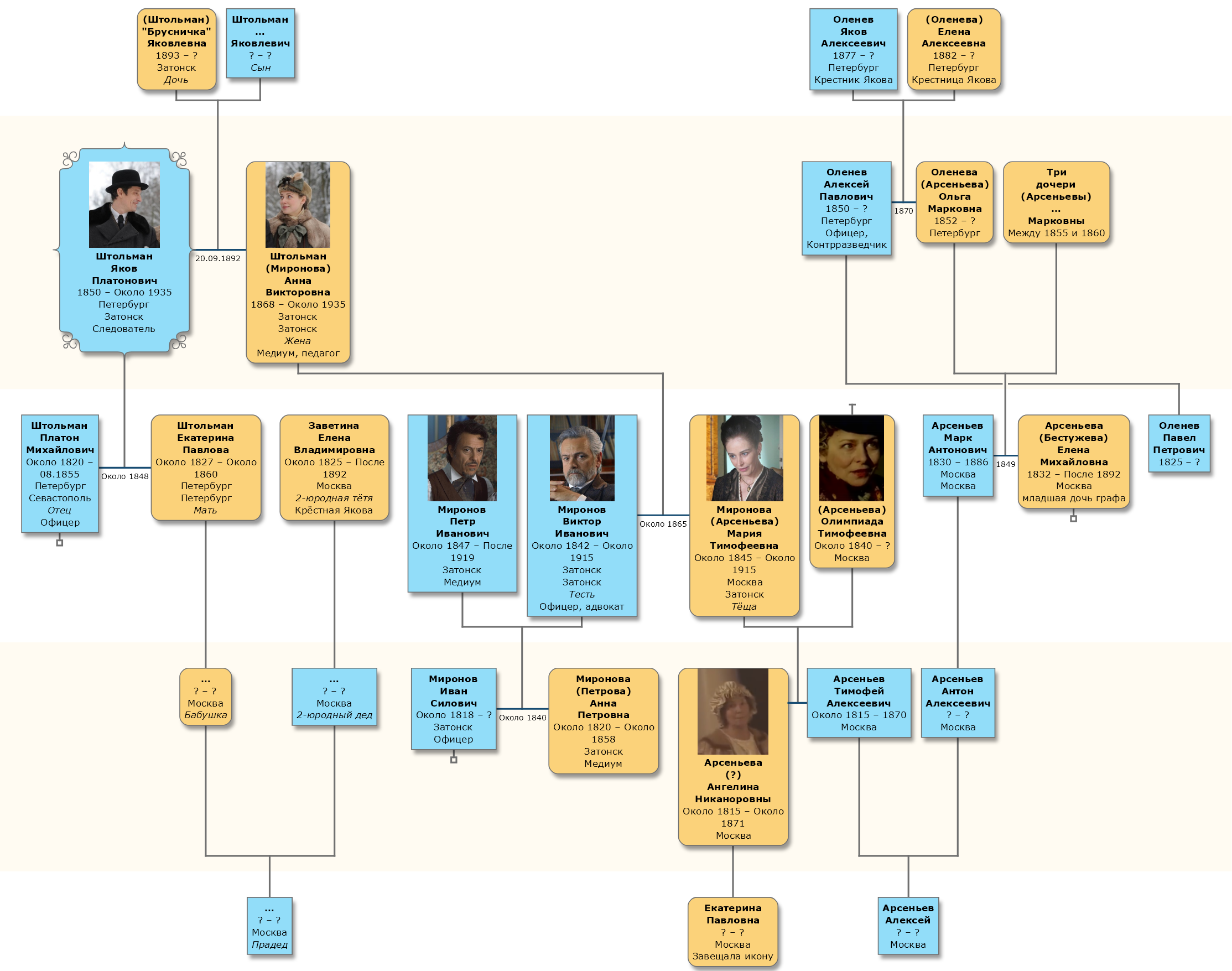 Для визуализации — кто кому сват-брат-крёстный — у меня есть готовое Древо Жизни семьи Штольманы-Мироновы.