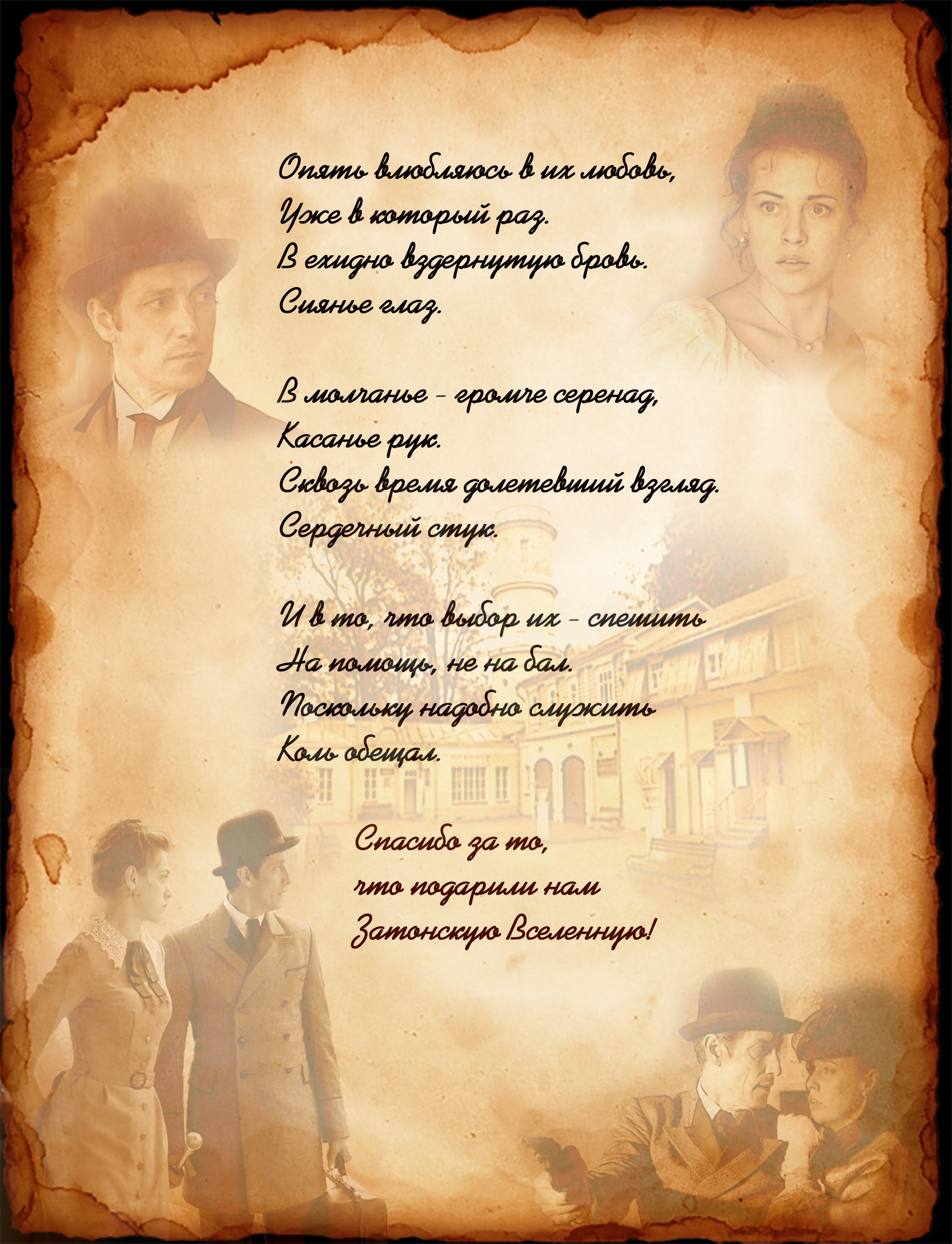 Мне очень нравится и идея, и исполнение. В стихотворении явная отсылка к РЗВ кмк только в двух последних строках, но и их можно приложить к личности героя, сыгранного Дмитрием Михайловичем. А Затонская Вселенная звучит прежде всего как комплимент сериалу.
